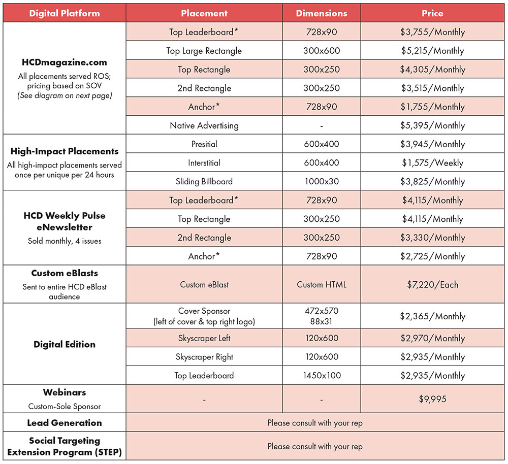 — Issue Highlights: 2026 HCD Conference + Expo Issue Project Watch Product Gallery Featured Content: • Rising Star awards • Breaking Through Competition: Spotlight on semifinalists • Evolving project delivery methods Product Spotlight: 2026 HCD Expo exhibitor products preview Bonus Distribution: HCD Conference + Expo Ad Close: 8/24/26 Materials Due: 8/31/26